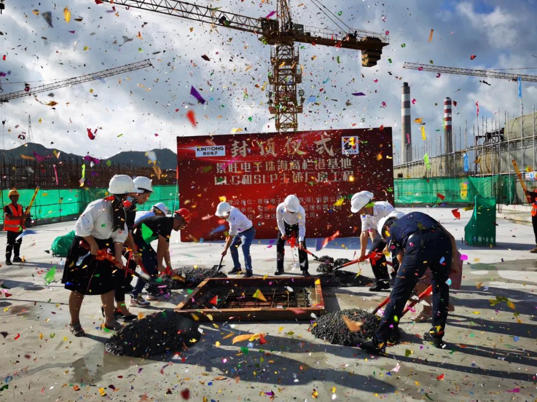 今天,珠海景旺高多层/SLP产业化项目主体厂房顺利封顶,标志着景旺电子珠海基地完成了项目重要的阶段性的建设任务,也是项目建设的重要里程碑。