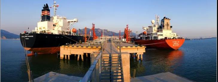 长长的码头深入到海中间,一艘满载石油的油轮靠泊在码头上正在进行卸油作业,原油通过码头上的输油管道,源源不断地输送到岸边不远处的一个个巨型油罐里……